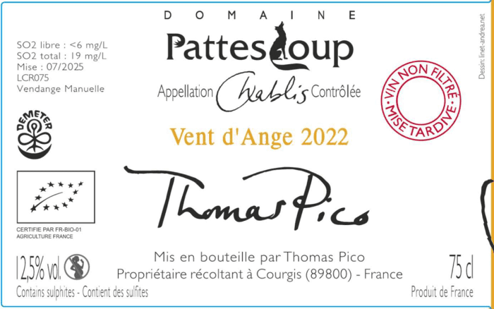 • TerroirGelige klei en kalk op kimméridgien, van drie percelen: "La Ménarde", "Les Malantes" én "Pattes Loup". Pattes Loup is het perceel dat Thomas van zijn grootvader heeft geërfd.